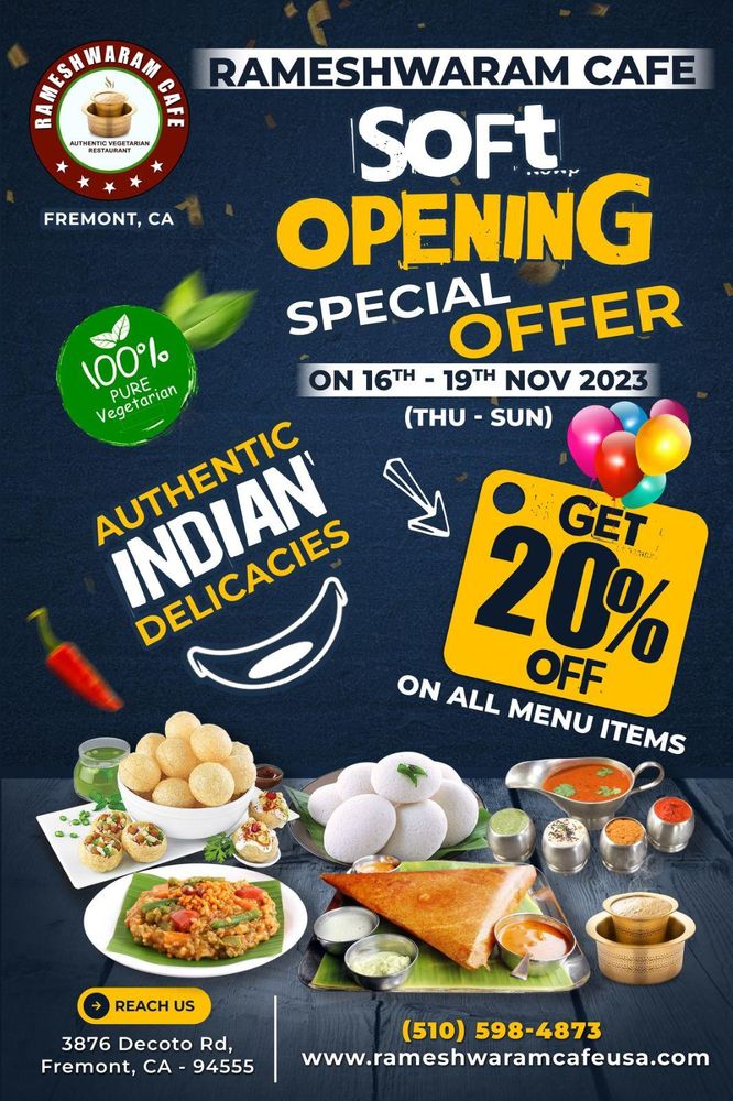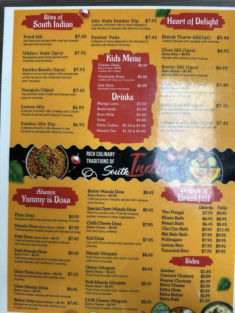 Introducing Rameshwaram Cafe, an Indian restaurant located in Fremont, CA. Offering delivery, takeout, reservations, and a family-friendly atmosphere, it is a go-to spot for authentic Indian cuisine. The menu boasts a variety of breakfast options like Puliyogare, Ven Pongal, and Lemon Rice, as well as tempting dosa variations such as Masala Dosa and Ghee Masala Dosa. Customer reviews highlight the warm ambiance and attentive service, with a nod to the eco-friendly initiatives like using bamboo utensils. Standout dishes include the Bangalore style dosas, Lemon Idly, and the Mini Tiffin Combo. While some customers note areas for improvement in service, the overall consensus is on the quality and flavors of the food. If you're looking for a taste of home and delicious Indian fare, Rameshwaram Cafe is a must-try dining experience.