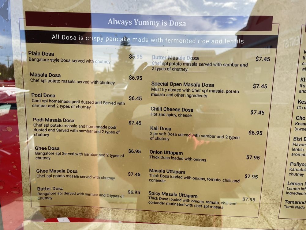 1 piece Bangalore spl. Served with sambar and 2 types of chutneys. Dosa is a crispy pancake made with fermented rice and lentils.